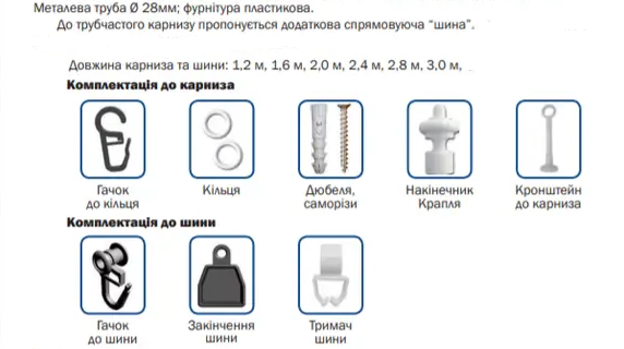 Комплектація: Карниз, кронштейни, гачки, кільця, наконечники